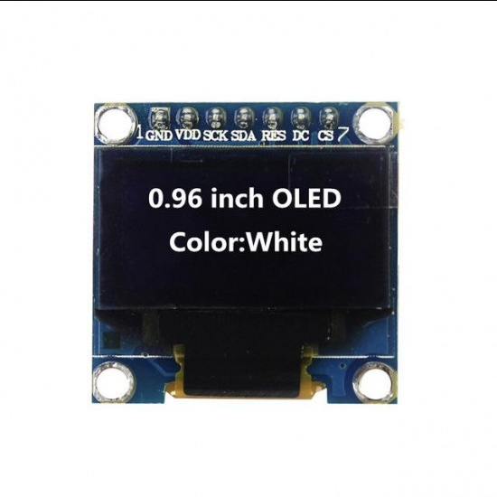 0.96 inch OLED Display Module White I2C 128x64 - 7 Pin is a display module can be interfaced with any microcontroller using SPI/IIC protocols. It is having a resolution of 128x64 . The package includes display board,display, 7 pin male header pre soldered to board.