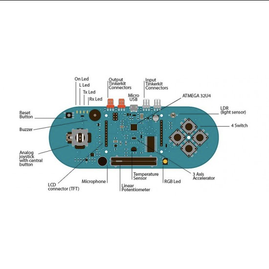 The design of the Esplora board recalls traditional gamepad design with the analog joystick on the left and four push buttons on the right. The Esplora has the following onboard inputs and outputs :