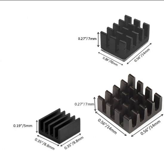 This is Black Aluminum Heatsink for Raspberry Pi an aluminum heatsink kit used for cooling the chips on Raspberry Pi. Comparing to other heatsinks, it has been attached with thermally conductive adhesive tape, allowing the Raspberry Pi to cool more efficiently. This 3 in 1 Black Heat Sink Set of Aluminum is Suitable for Raspberry Pi B+, Pi 2 B, Pi 3B, Pi 4B