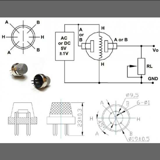 Sensitive material of MQ-5 gas sensor is SnO2, which with lower conductivity in clean air. When the target combustible gas exists, The sensor’s conductivity is higher along with the gas concentration rising. Please use simple electro circuit, Convert change of conductivity to the corresponding output signal of gas concentration.