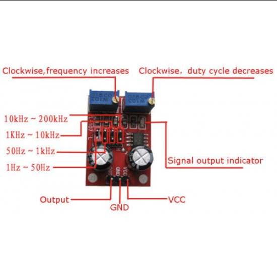 NE555 Pulse Frequency Duty Cycle Adjustable Module Square Wave Signal Generator is 5 V square wave signal generator. It generates a square wave signal used for experimental development. Also, use to drive a stepper motor for generating a square wave drive signal.